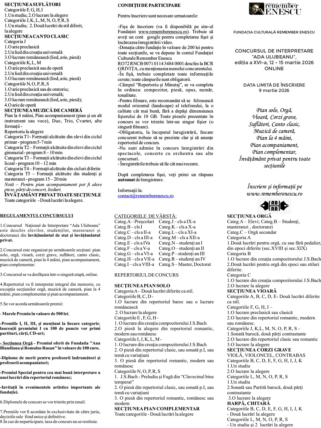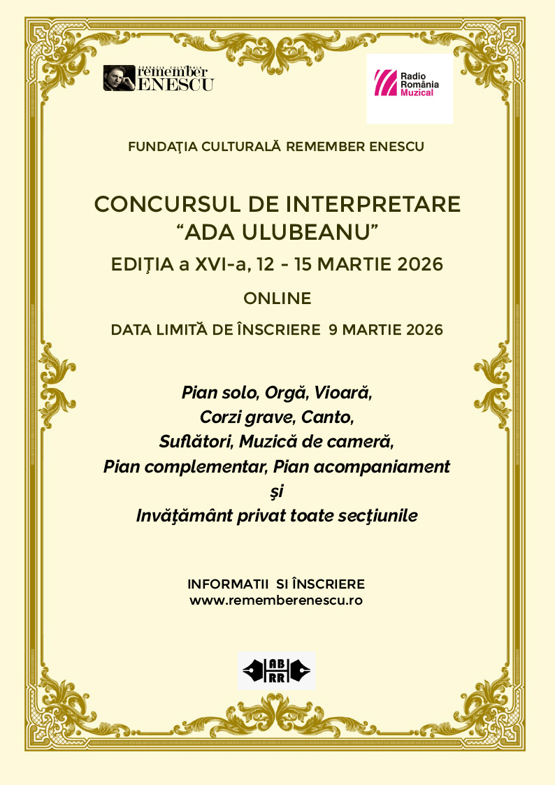 — Filed Under: Fundatia Culturala "Remember Enescu" > Concursuri > Concursul National de Interpretare “Ada Ulubeanu” > Concursul National de Interpretare “Ada Ulubeanu” editia a XVI-a, 12-15.03.2026